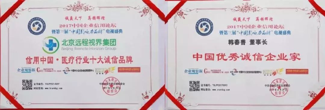 那两张荣誉证书,一张上写着“信用中国·行业十大信用品牌”,是授予远程视界的;另一张写着“中国优秀诚信企业家”,是授予韩本人的。