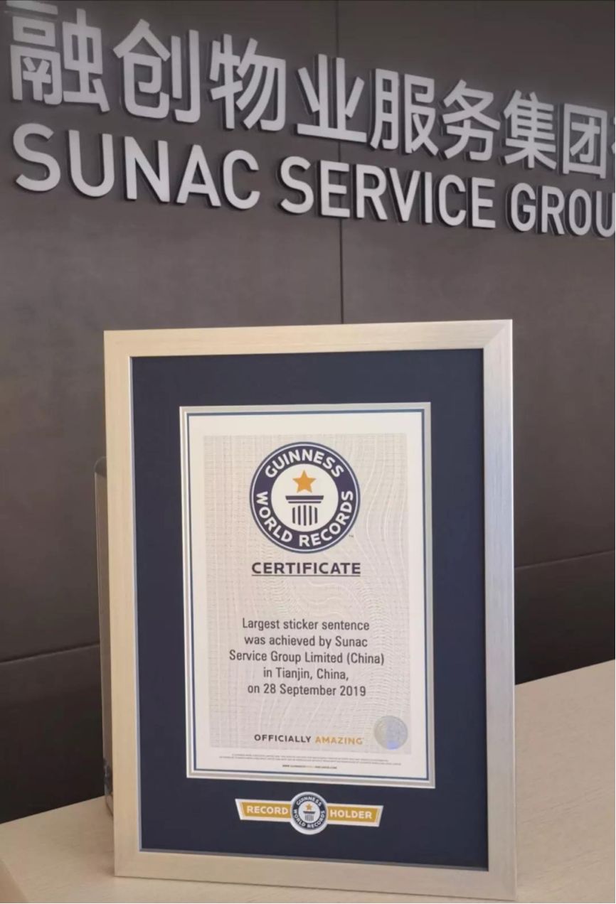 9月28日,天津融创·奥城住宅区。156名融创家人,历时3个多小时,共同完成了由6808块贴纸拼出的“融创归心 至善致美”八个大字——成功打破吉尼斯世界纪录称号“最大的贴纸语句”,并以三倍于原纪录的贴纸数量,获得吉尼斯世界纪录官方认证!