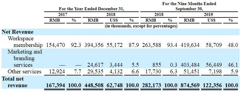 四年的时间内,它通过空间拓展、强化社群、连接生态、并购合作等方式,快速发展。招股书显示,其规模在快速增长:2017年净收入1.67亿元,2018年为4.49亿元,同比增长168%;2019年前三季度净收入8.75亿元,同比增长210%。