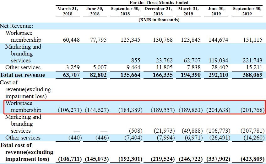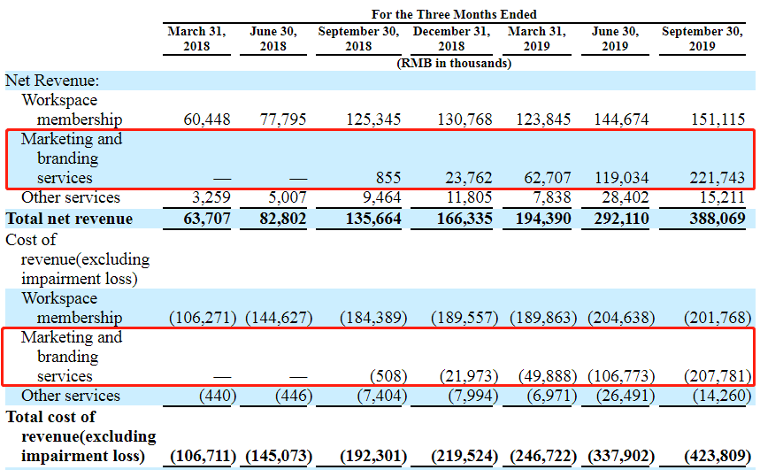 由轻资产模式所带来的收入在优客工场的招股书中被计入了“营销和品牌服务”。数据显示,其于2018年第三季度开始第一次计入,虽然前期也是成本高于收入,但到了2019Q3实现了收入高于成本——收入2.22亿元,成本2.02亿元。