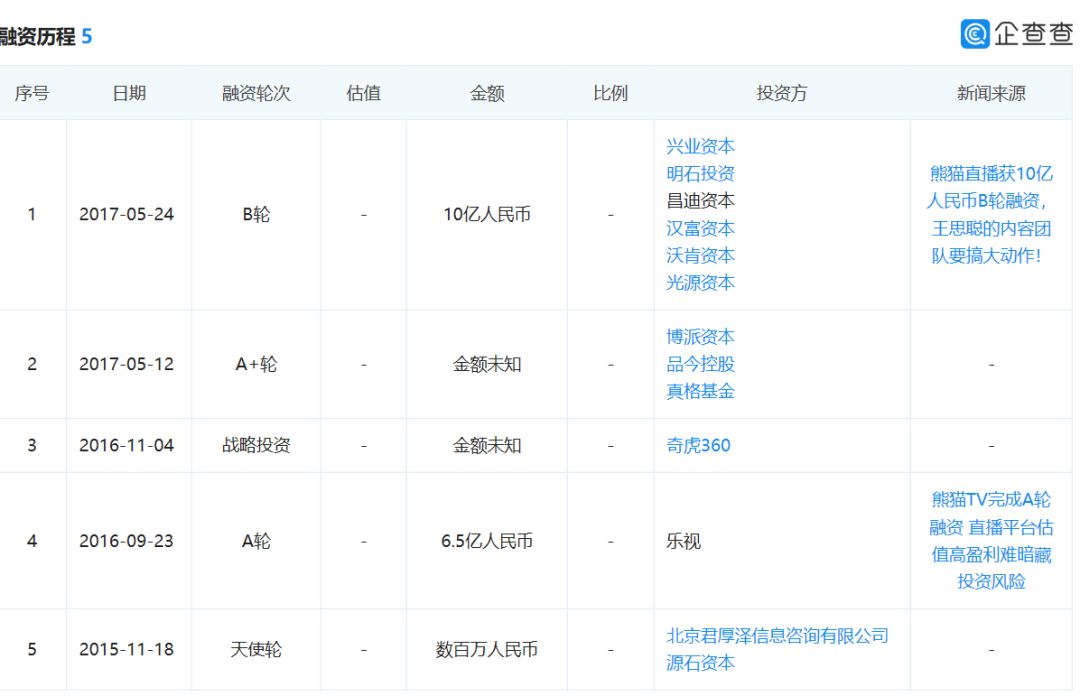 只是这一辉煌来自于2017年5月的B轮融资完成时。当时,上线两年的熊猫直播,已完成多轮融资,融资金额超过16.5亿元。投资人中,有知名的互联网大佬,周鸿祎、贾跃亭,也有光源资本、真格基金等。