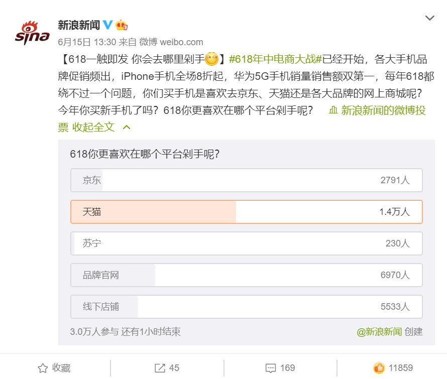 如果说去年是京东的“618”主场开始动摇的一届,那么今年,其主场地位再次经受挑战,甚至被抢夺。6月15日,新浪新闻一项针对用户618去京东还是天猫购买3C产品的调查显示,选择去天猫平台购买的用户数是京东的5倍。