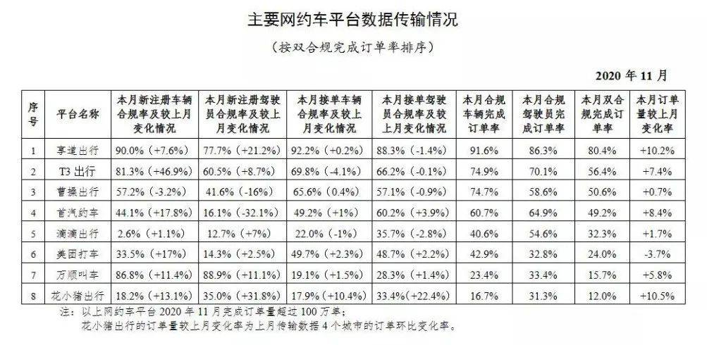 | 交通运输部全国网约车监管信息交互平台发布11月主要网约车平台数据情况