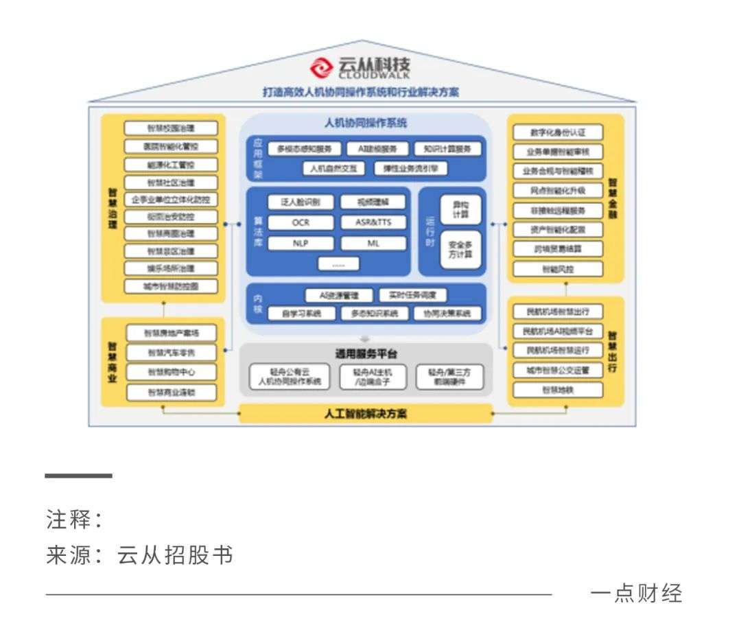 云从主要提供的服务有两项,人机协同操作系统和人工智能解决方案。前者是指软件系统,包括基础操作系统、核心组件和应用产品,涉及云平台、生物识别系统、人脸识别系统等;后者指提供定制化产品,主要有智慧治理、智慧金融、智慧出行、智慧商业四个领域。