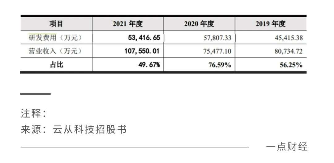 造成亏损的一大原因是高额的研发投入占了营收大半,2019年至2021年,云从的研发费用分别为4.54亿元、5.78亿元和5.34亿元,三年累计研发投入占营收的占比为59.39%。