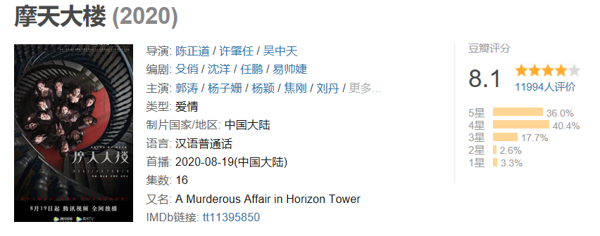 《摩天大楼》,主打悬疑犯罪。和之前大火的《隐秘的角落》是同一题材,而且,都是群像剧。