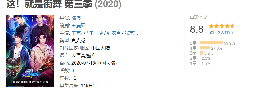 在前两季的豆瓣分数至今稳定在8.7分与8.7分之后,《街舞3》的开分高达9.1,即使是遭遇了导师全换血也丝毫没影响节目的开局口碑,新任四位导师的惊艳街舞表现、国内街舞大神肖杰等人的出色发挥,《“囍”》等编舞出圈的表现,以及来自法国的hiphop(自由式)街舞大神布布等直接拉高的比赛水准,令节目一度成为国产综艺的新神话。