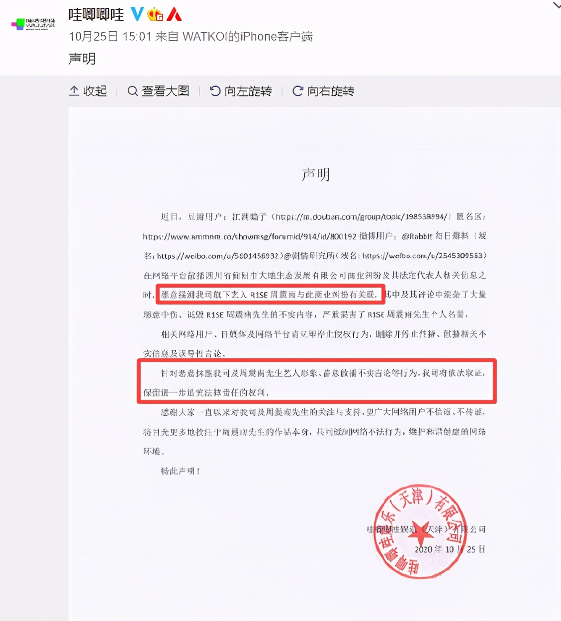 周震南的经纪公司哇唧唧哇也发声明回应说,这是恶意揣测旗下艺人周震南与此商业纠纷的关联,严重损害了周震南个人名誉。