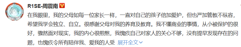 周震南在文中感谢父母教育和爱护,表示要和他们一起挺过难关,以后会努力工作,为他们撑起一片天。