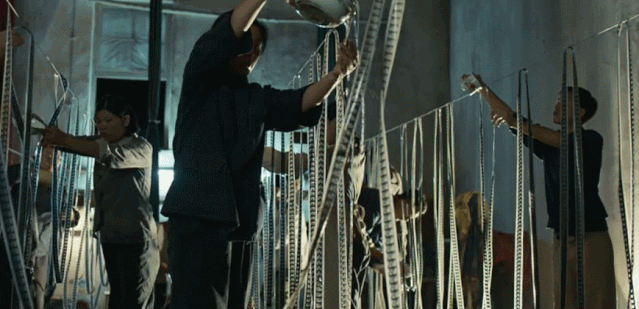 只是比起过去张艺谋电影那些浓墨重彩的视觉奇观。如《大红灯笼高高挂》的大宅院、《英雄》中的万箭齐发、《影》里的伞阵,这场对胶片的洗涤和擦拭场景既充满奇观色彩,又朴素动人,更多是被注入了张艺谋对电影的深情。