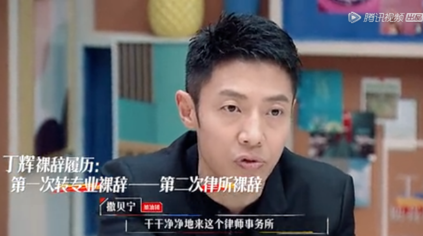 硕士毕业后,曾在另一国内一线律师事务所担任律师助理。为了参加节目到君合实习,丁辉再次选择裸辞。