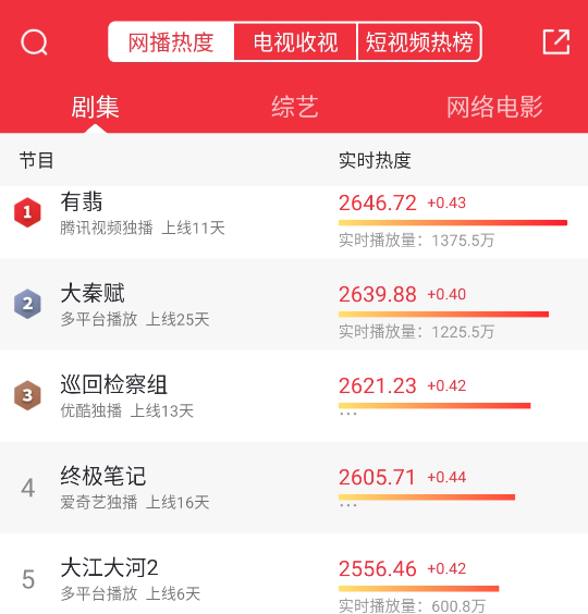 相比之下,根据酷云数据显示,两台首播的《大江大河2》,收视率持续在0.5%左右。在猫眼全网热度榜中,《大江大河2》也仅排在第五位,热度远不及《有翡》和《大秦赋》这样的热门剧。
