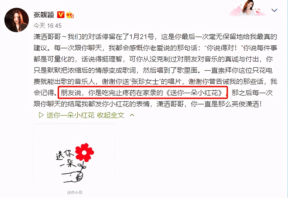 张靓颖在回忆两人的交往时,提到他的遗作是吃着止痛药在家录的。而这首遗作,就是《送你一朵小红花》的片尾曲。