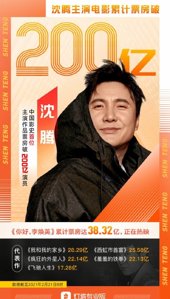 据灯塔专业版数据显示,截至2021年2月21日8时,随着电影《你好,李焕英》累计票房超38.3亿,沈腾电影作品票房超200亿,成为中国影史首位200亿票房演员。