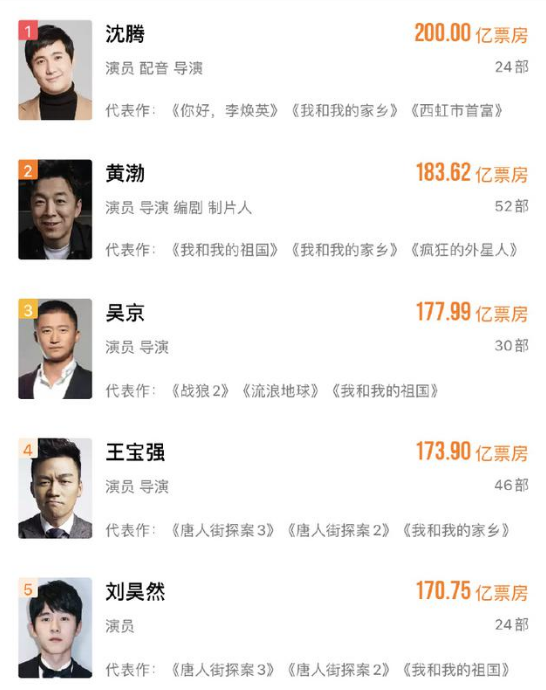 而排在沈腾后面的,则是拿下183亿的黄渤、177亿的吴京和凭借《唐人街探案3》票房大涨的王宝强和刘昊然。