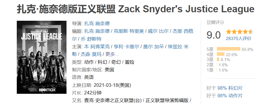 从豆瓣6.4到豆瓣9.0,扎导版《正义联盟》甩了好莱坞一个大嘴巴子。