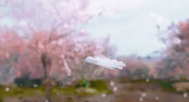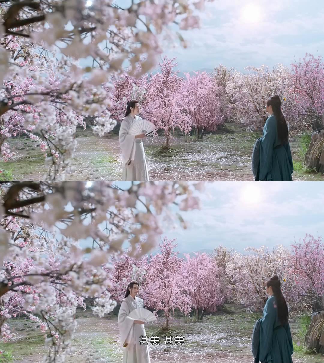 前一个场面中,由于尚且不知道彼此底细,二人相互过招的动作都带着试探的意味。但主创拍出了两位男主在空中轻盈回旋的镜头,勾勒出一幅桃林武侠画卷。