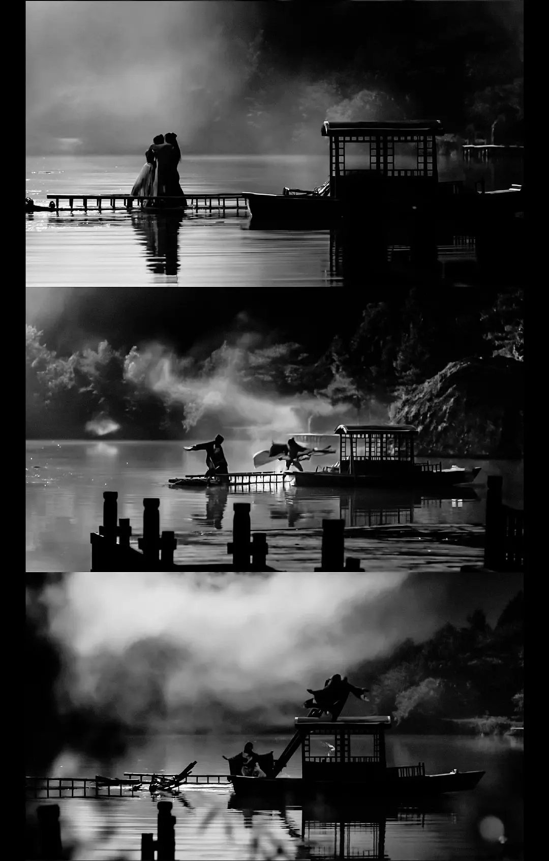 湖上名场面则出自第六集,两位主角已经共历生死,周子舒终于放下心中戒备以真面目与温客行相对。二人在水雾弥漫的月下湖面交手,场景富有诗意,动作设计如行云流水,剪影之下被认为颇有几分昔日徐克经典武侠片和李安《卧虎藏龙》竹林戏的感觉。