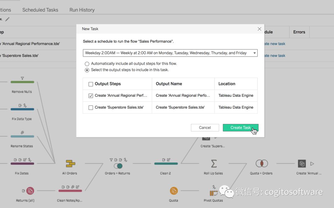 可以将流程安排在需要时(白天晚上均可)运行。这样可做到自动执行数据准备流程,确保始终有准备好的、可直接用于分析的最新数据。