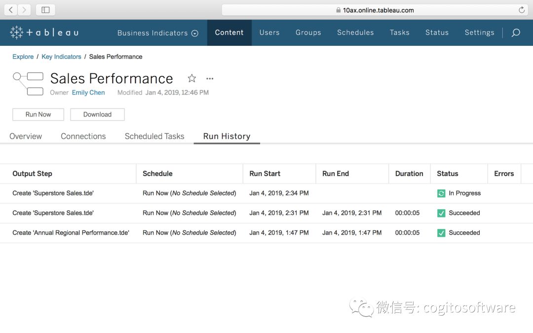 现在,可以使用 Tableau Server 中的那些工具来监视流程。使用“状态”页面、管理员视图和运行历史记录,可以查看整个服务器中的各个流程的运行状况,以便快速处理问题。而通过接收主动通知,随时都能了解流程是否正常运行。