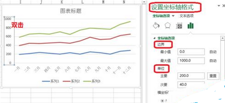 2、双击坐标轴——设置坐标轴格式——坐标轴选项——边界,单位。根据实际情况进行设置。