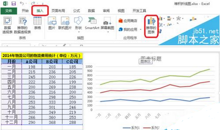 1、选中表格的数据区域——点击插入——推荐的图表——堆积折线图。