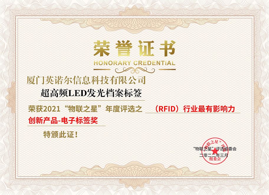 英诺尔最终从参评企业中脱颖而出,荣获2021“物联之星”年度评选之(RFID)行业最有影响力创新产品-电子标签奖。