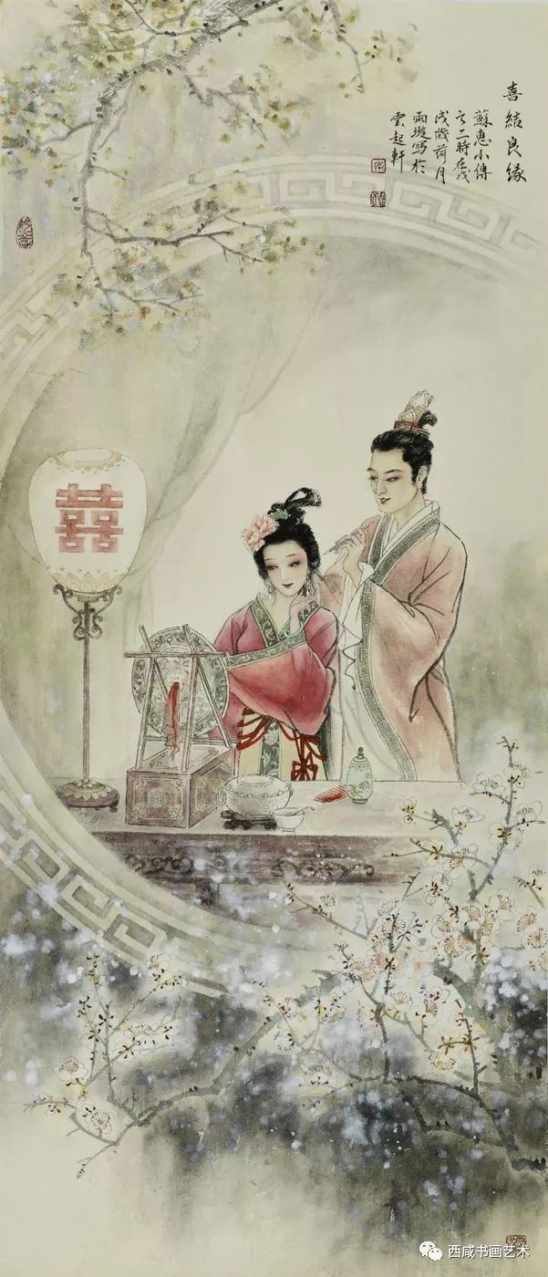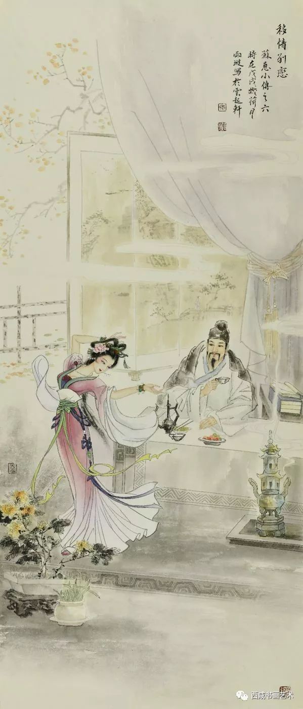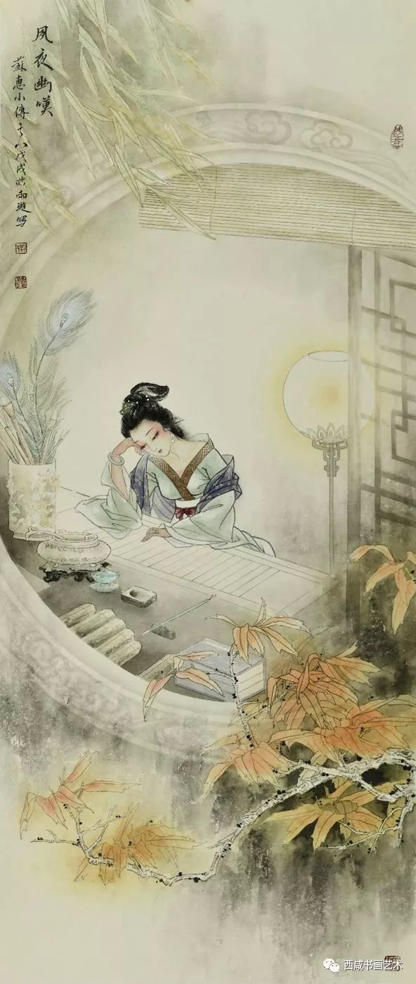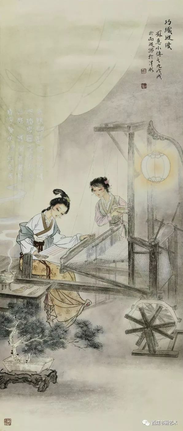 2017年,郭雨璇应陕西苏绘实业有限公司之邀,为公司《苏绘文化广场》及《苏绘锦悦府》而作《苏蕙小传》。自此她认真查阅历史资料,拜访学者、教授及璇玑图研究专家,到苏惠故事发生地及窦滔墓前采风,读璇玑图,感受一代才女的诗情才情和感情。苏蕙一生悲喜的起起落落,沉沉浮浮;苏蕙少女时的聪敏,巧遇恋人的惊喜;初为人妇的娇羞,别后相思的煎熬;遭遇命运突变时的痛苦与无助,寄情诗书与锦织的深情与柔韧,执著与坚定……,是她对苏惠及窦滔的人物形象有了一个比较全面的认识,人物性格在她心目中也更加丰富和完善。一年来,她为完成《苏蕙小传》十二幅作品感到高兴,更为读到才女的诗文而感到充实和欣慰。她说:公元2018年,隔着时空读完苏蕙的一生,感佩她的坚韧与才情,感谢她如镜,照见我智慧的黑洞