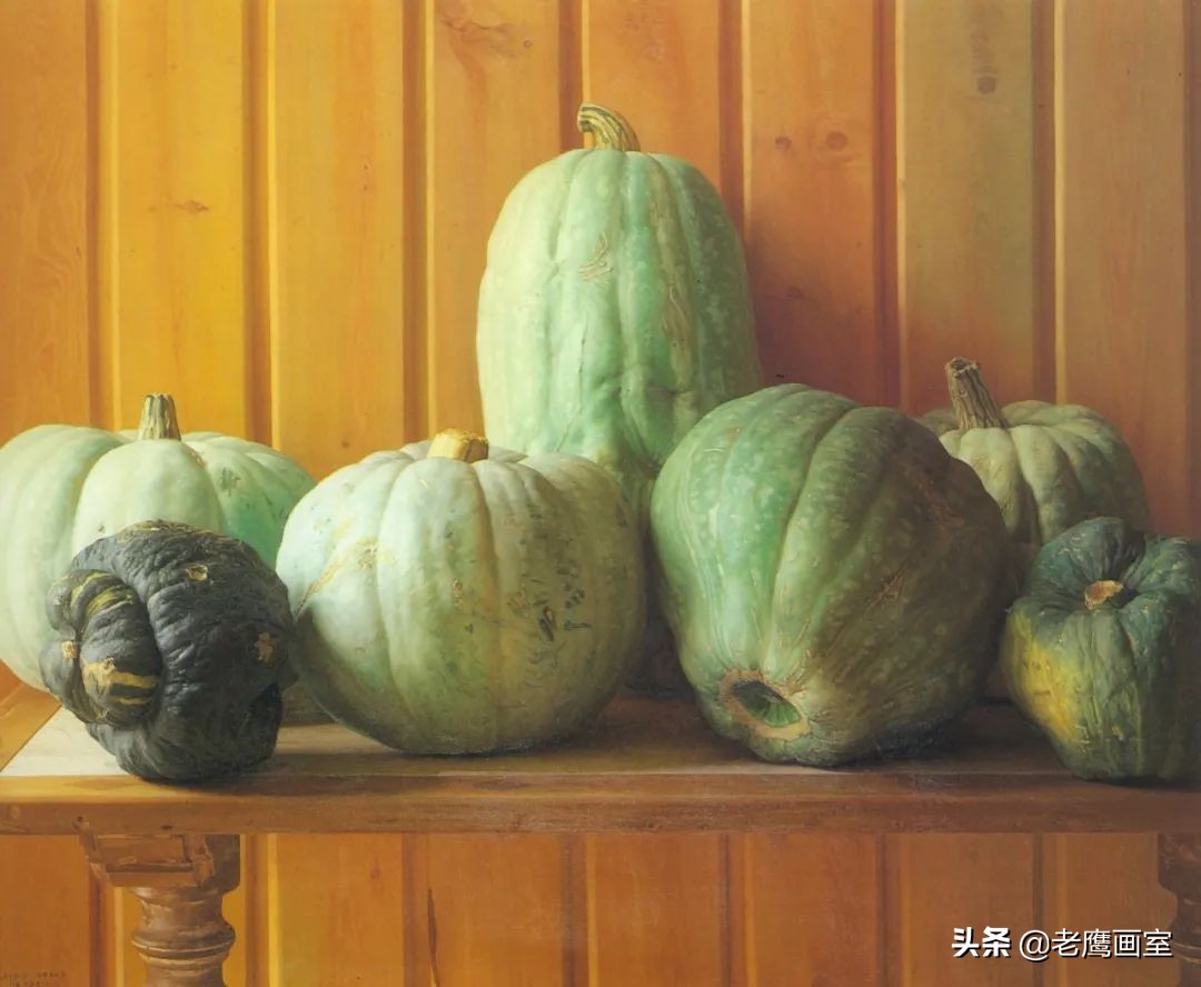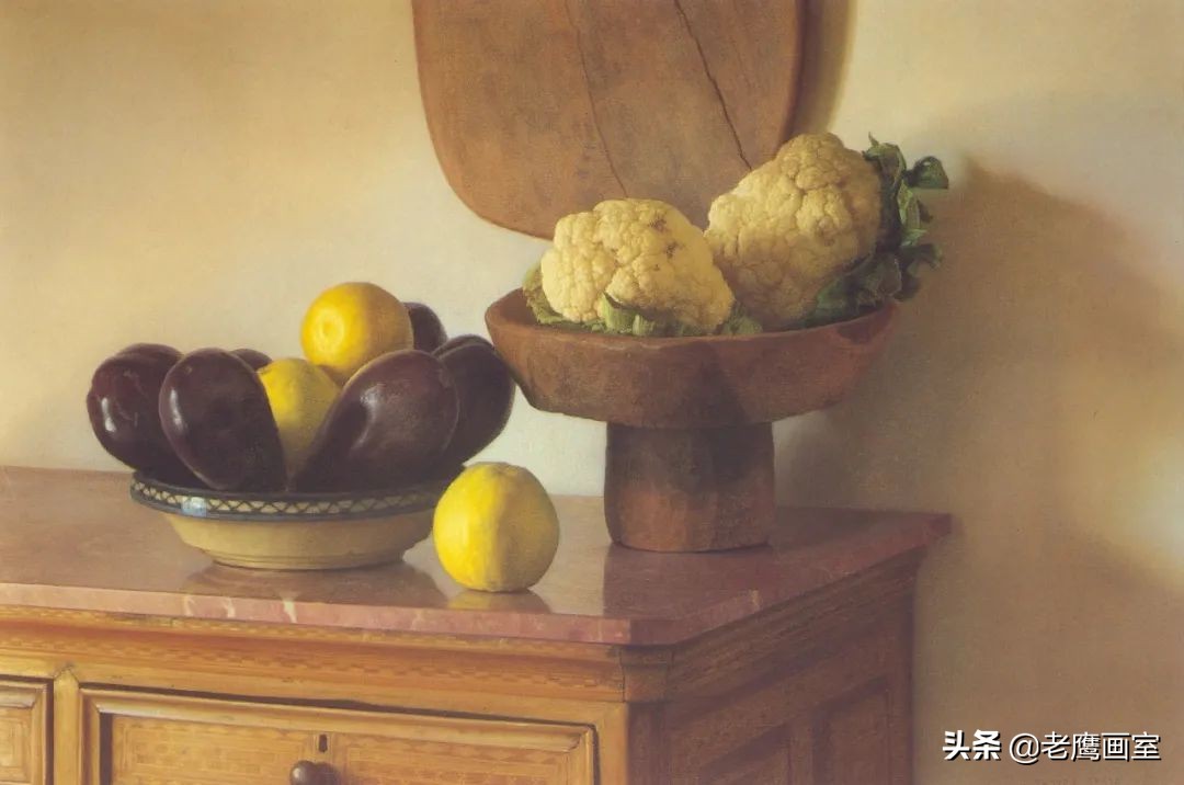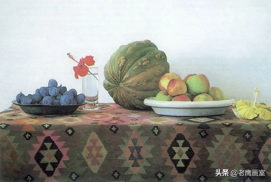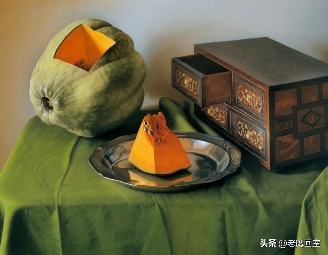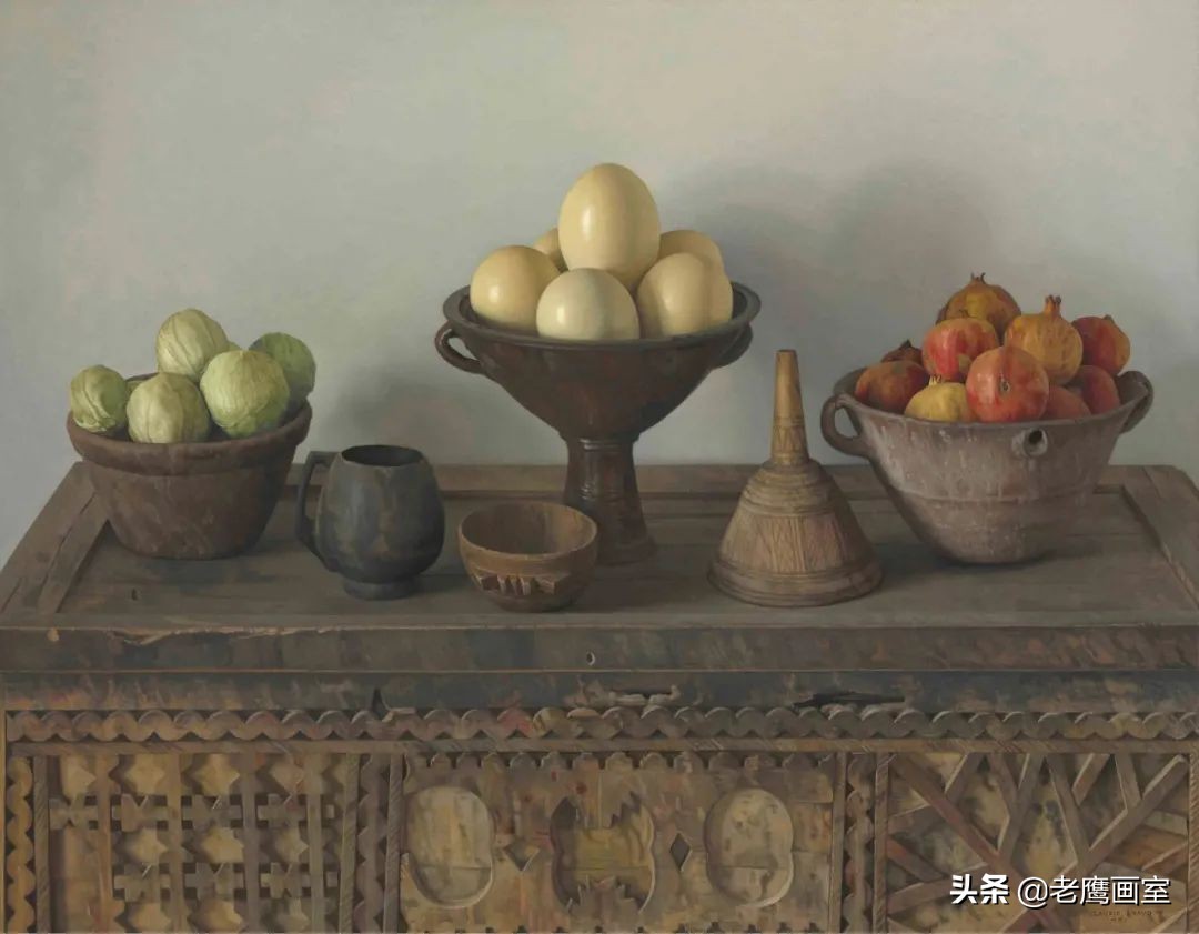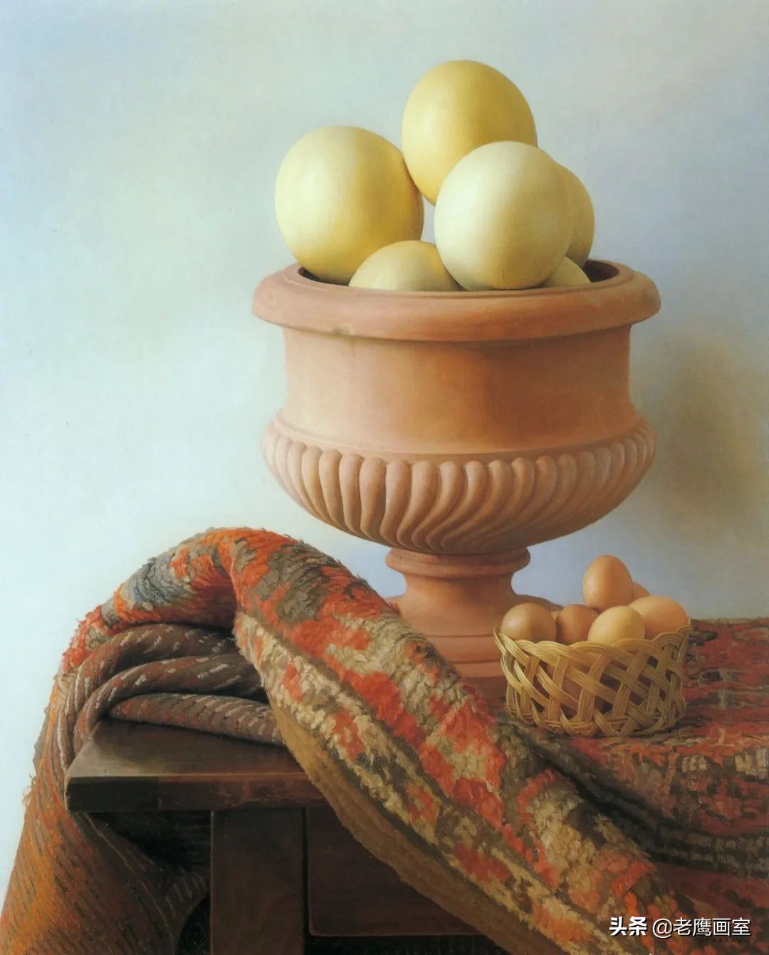 他的静物画中的静物是有生命的,这些鸵鸟蛋、柠檬、桃子、南瓜、鸢尾花、器皿,等等,无一不渗透着画家的情感,画家将其作了拟人化的处理,赋予其人的品格和个性,并使其充满了一种典雅、理智且朴实、自然的审美趣味。