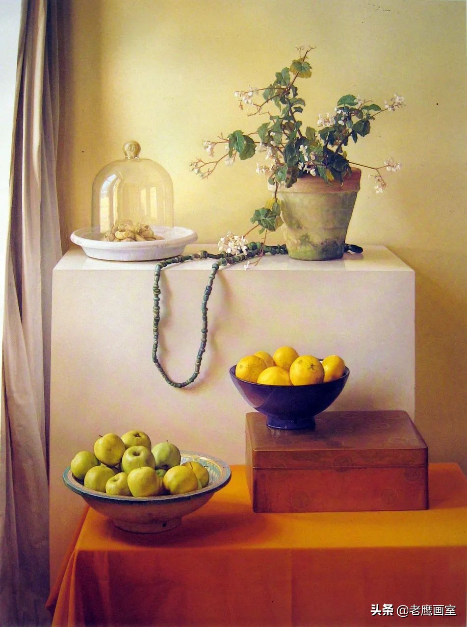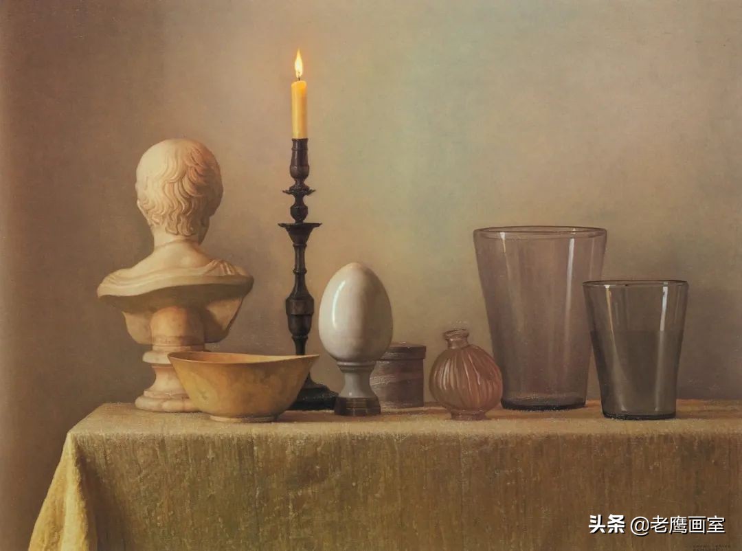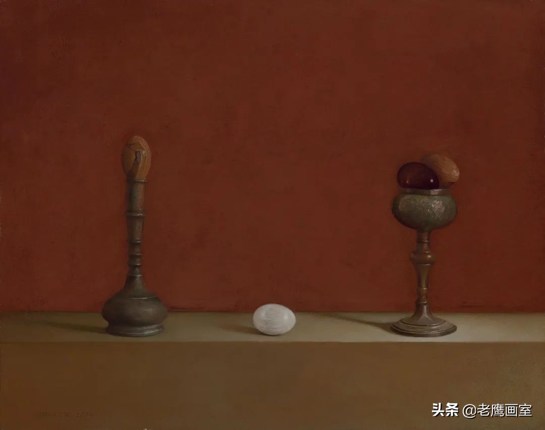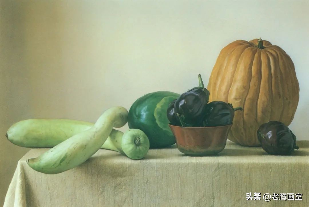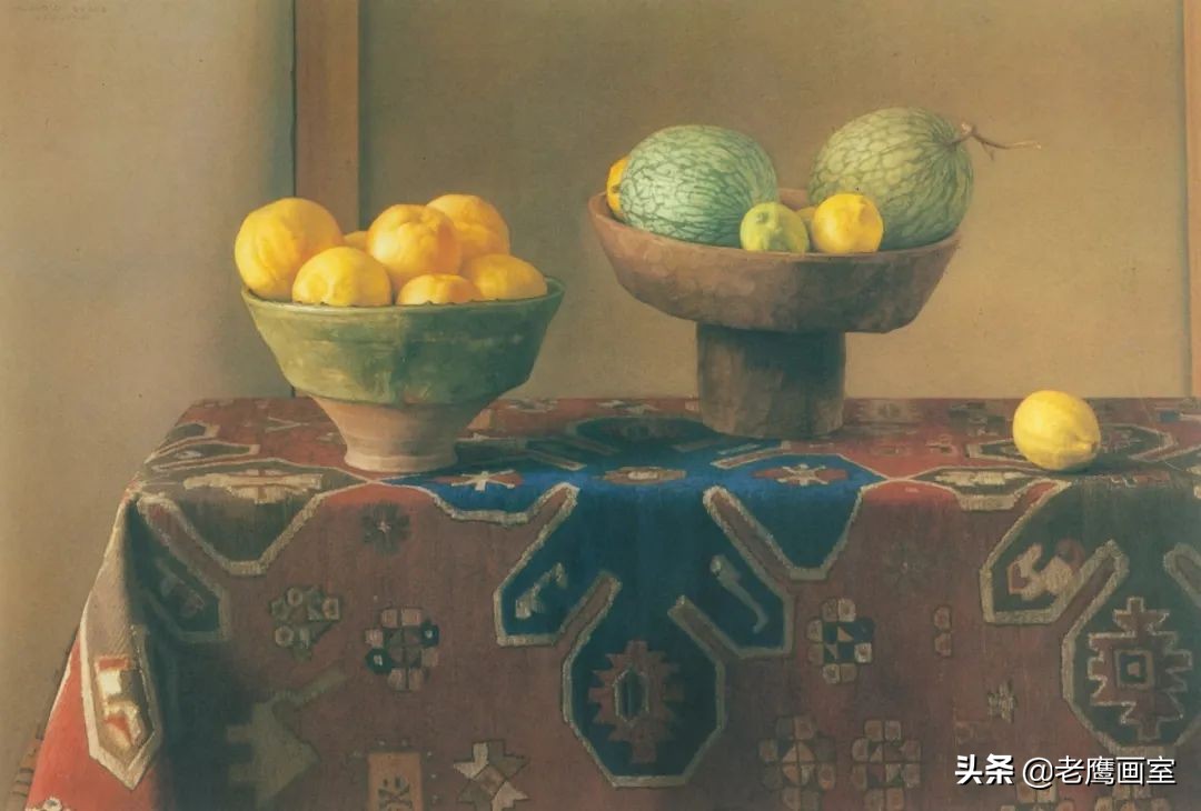 他的静物画中的静物是有生命的,这些鸵鸟蛋、柠檬、桃子、南瓜、鸢尾花、器皿,等等,无一不渗透着画家的情感,画家将其作了拟人化的处理,赋予其人的品格和个性,并使其充满了一种典雅、理智且朴实、自然的审美趣味。