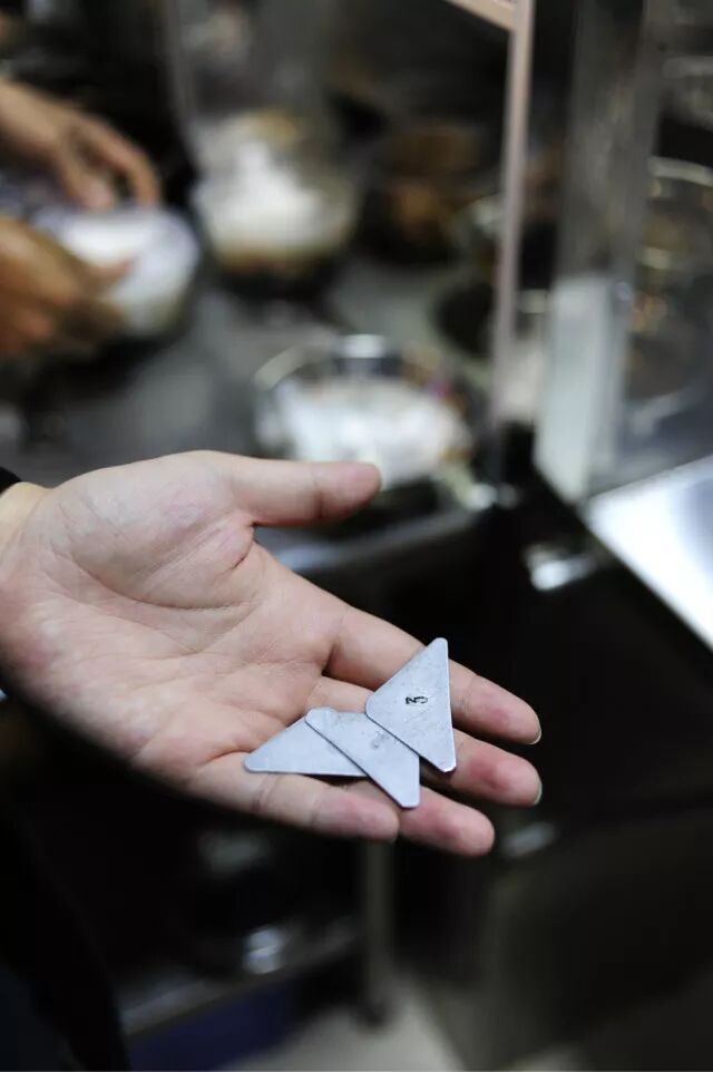 原来三角形代表的是椰子水清补凉,梯形代表的是椰奶清补凉。老顾客看到这个小铁片,就知道这还是原来的味道。