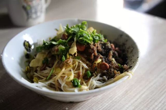 干捞海南粉的精髓在于拌。一筷子下去,卤汁均匀地裹上每根米粉,米粉就有了灵魂。粘稠的卤汁将各种配料粘在米粉上,一口就能嚼到软的米粉和脆的牛肉干、花生的复合味道。
