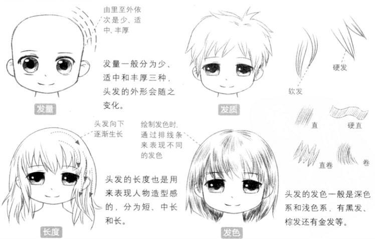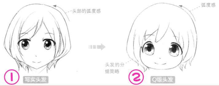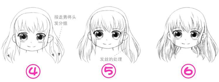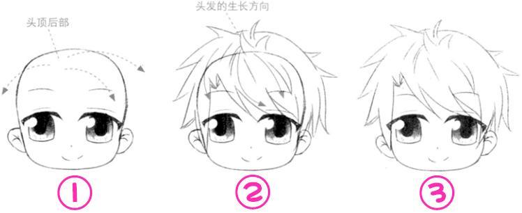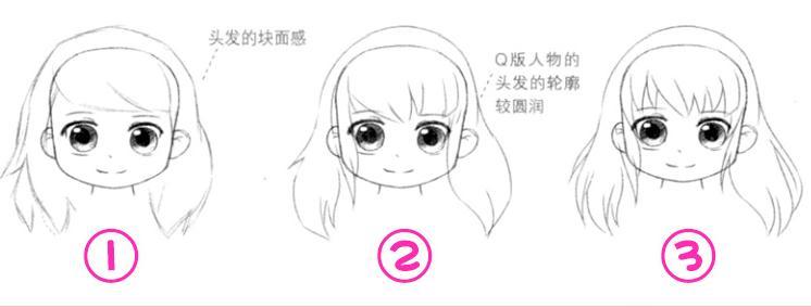 Q版与普通头身的头发绘制都是根据人物头部的圆形弧度来绘制的,一般前部都有适量的刘海。