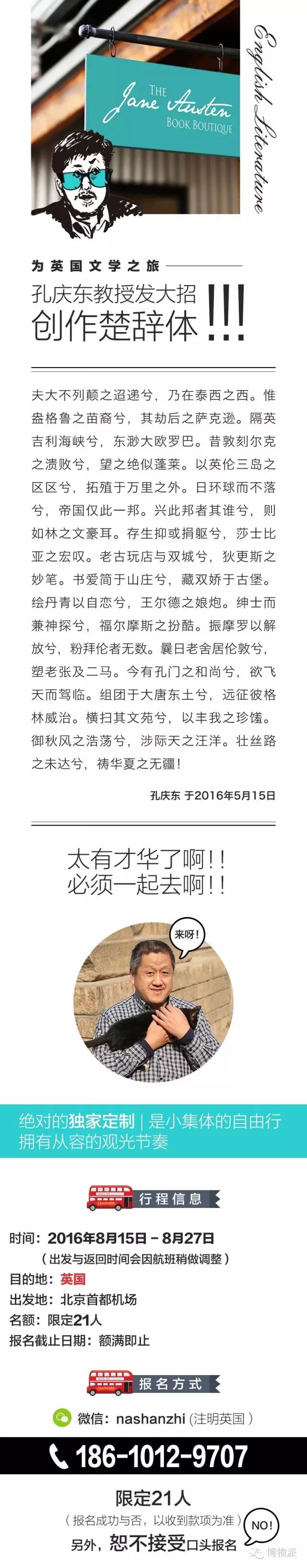 2016年8月15日至8月27日,孔庆东老师和他和文学自媒体《孔曰》,将带领大家走进英国,开启英国文学视频录制之旅。欢迎你来参加《孔曰》的视频录