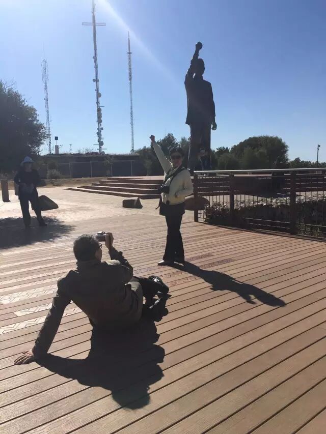 曼德拉雕像前,秦晖老师为金雁老师拍照