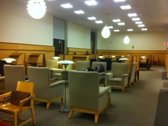 首先,这张广为流传的图片上的图书馆,根本就不在哈佛。留学生们经过认真调研后发现,哈佛几乎所有的图书馆都在零点前闭馆,只有一个叫做Lamont的图书馆24小时开放。而这家图书馆在考试季的凌晨四点拍的实地图片是这样的。