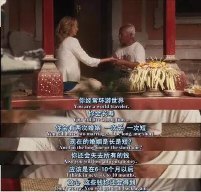 一次偶然的机会,伊丽莎白·吉尔伯特来到了巴厘岛,一位年迈睿智的占星老者,勾勒出她即将启程的旅途。从这里开始,影片渐臻佳境,主题也丝丝入扣地缓缓表达出来。