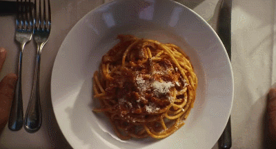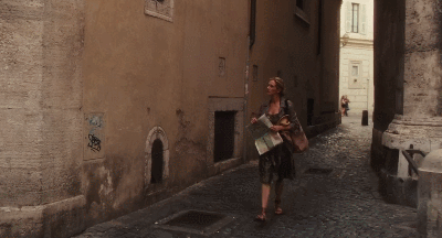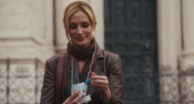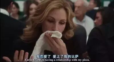 意大利的重点,是美食,她“和比萨谈恋爱”,她凝视一盘意大利面许久,突然身心激荡似大口吞咽着意面,