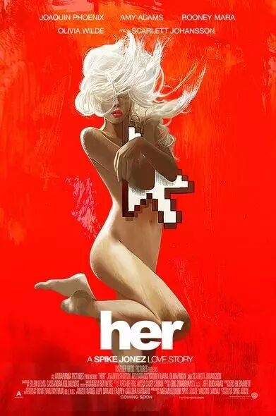 这部斯派克·琼斯导演的科幻浪漫电影中,尽管斯嘉丽在片中没有露脸,她作为电脑操作系统里的女声Samantha,沙哑的性感声音已经征服了杰昆·菲尼克斯所饰的作家西奥多。一开始给Samantha配音的是恰好重名的萨曼莎·莫顿,她与杰昆·菲尼克斯每天都在片场,但影片拍完后,斯派克剪辑时感觉不对,他找来斯嘉丽把整部电影重新配了一遍音,取代了莫顿。而斯嘉丽也凭借性感的声音成了影片不露脸的女一号。
