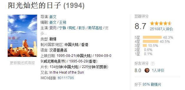 事件回到1994年,由夏雨和宁静主演的电影《阳光灿烂的日子》是姜文导演的处女作,这部作品豆瓣评分高达8.7分,许多影迷都认为这是姜文最好的一部导演作品。