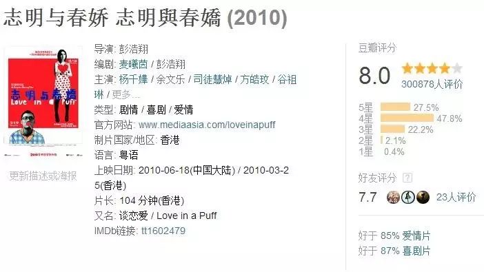 但是简单并不代表没意思,导演彭浩翔也是想把自己的“春娇志明”拍成像“爱在三部曲”这样的爱情故事。而且影片也确实感染了无数的“善男信女”。《志明与春娇》在豆瓣上在 30 万人次观看后,有着 8.0 的高分。
