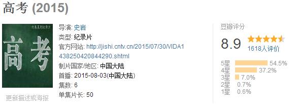 高考,一场影响亿万中国人命运的考试。2015年的六集纪录片《高考》豆瓣评分高达8.9。这个系列纪录片就选取深具代表性的不同社会横断面,记录个人故事、观照社会热点,从多个侧面走近并记录2014年高考,为我们留下这个时代意味深长的社会现实记忆和思考。