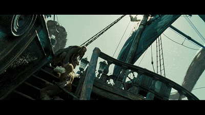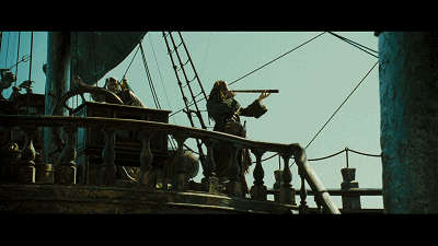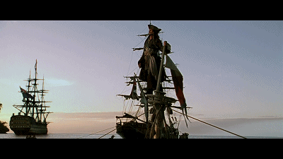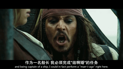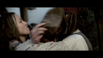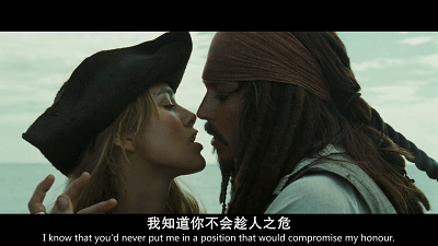 还有,杰克在“黑珍珠”甲板上,试探性地向伊丽莎白求婚。很搞笑!他说:“我是船长,我随时都可以在这里举行一个婚礼,就在这,就在这甲板上。”真的很可爱。后面他还说“总有一天你会接受海盗的生活。总有一天你会接受我。”