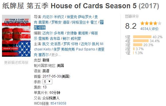 不知不觉《纸牌屋》已经拍摄到了第五季,从2013年开始,这部由奈飞公司(Netflix)出品的政治题材电视剧,一直延续着高标准,第五季更是上演了夫妻间的相爱相杀,豆瓣评分高达8.2。