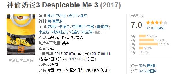 即使此次小黄人从新回归配角,从豆瓣的评分来看这个系列电影也是呈现一路走低的评分,由《神偷奶爸》高达8.5,到《神偷奶爸3》仅为7分。在海外IMDB获得6.5分,和“烂番茄”新鲜度62 %,爆米花指数66%,都是勉强及格而已。