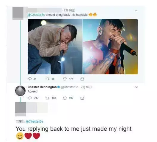 16日时,林肯公园其中一名粉丝曾上传2张查斯特-贝宁顿热唱中的照片,并写下留言“ChesterBe should bring back this hairstyle(希望查斯特能重新留回这个发型)”。查斯特也在近2个小时后回复“Agreed(我同意)”,让粉丝又惊又喜地表示“You replying back to me just made my night(你的回复让我的夜晚变得精采)。