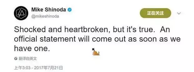 团员之一吉他手麦克-信田(Michael Shinoda)已在推特发文证实该消息,“震惊,心都碎了,但是真的!我们稍后会尽快发表声明。”