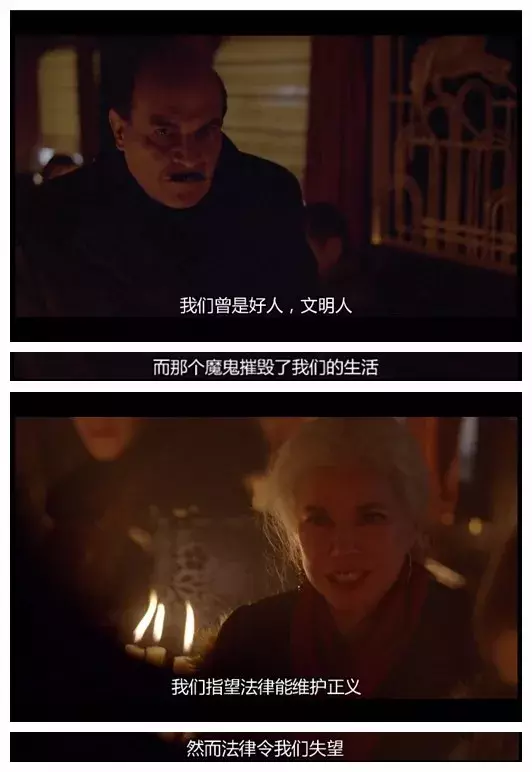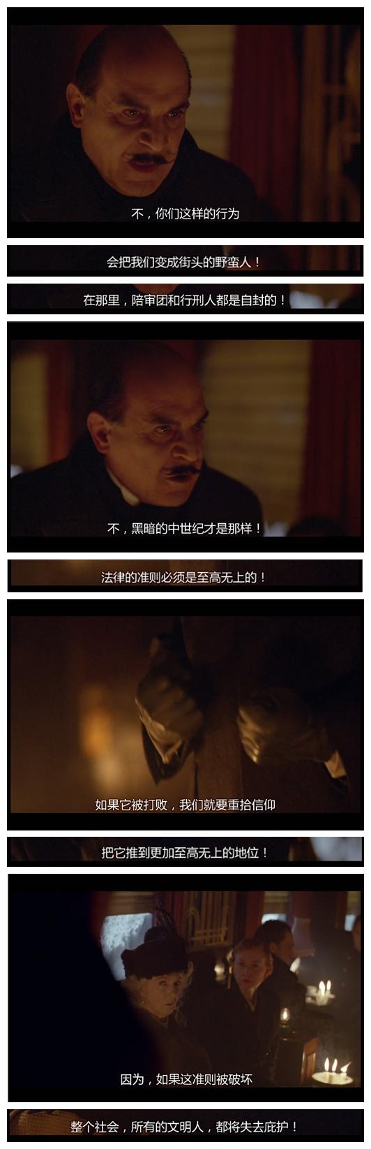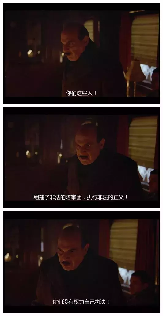 接下来,车厢里的犯罪嫌疑人们与波洛侦探之间的来往对话,就是一场“法律与正义”或者说“私刑是否是正义”的讨论。