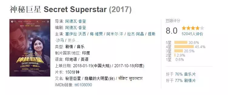 豆瓣评分也能看出一点端倪。《摔跤吧爸爸》在豆瓣的评分高达9.1,《神秘巨星》还在上映中,评分也上8了,按理说也不错,但是却有持续下跌的势头,从刚开始的8.4,掉到了如今的8分。