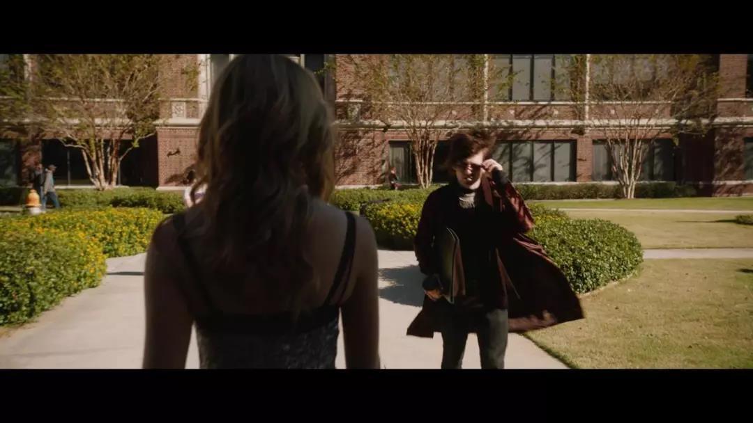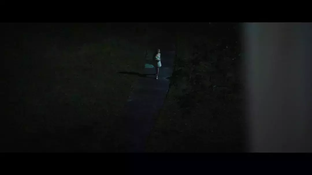 再不信邪的人这个时候估计也会掉头就跑,女主角走回到宿舍楼下。片子这个时候还给了一个从楼上向下俯视的镜头,好像有什么在窥视她。